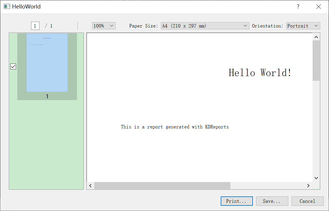 编译完成后,下面我们运行一个KDReport的例子,验证下编译是否完全正确。首先将KDChart编译生成的DLL拷贝到当前运行目录,然后双击HelloWorld.exe,运行结果如下。说明一切运行正确。