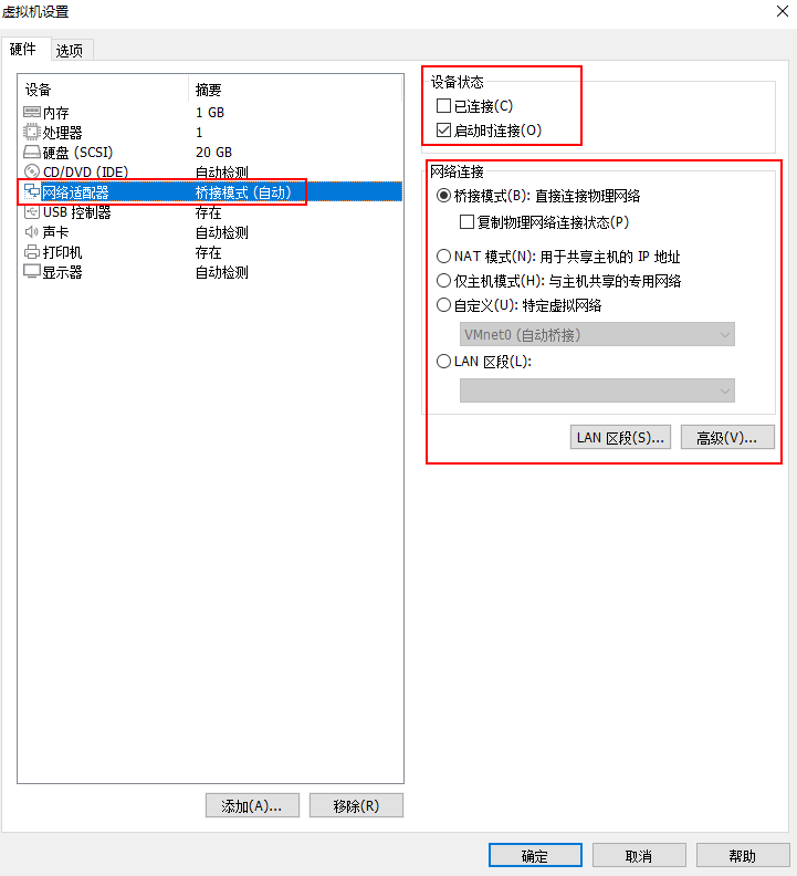 如果虚拟机中的CentOS系统的网络适配器不是MVnet0模式,可以界面右边进行选择,如果系统已经启动,则将“已连接”勾上。