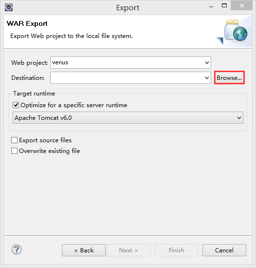 6、点击上午”Browse...“按钮选择war文件保存位置,然后点击”Finish“按钮即可将Web工程打成war