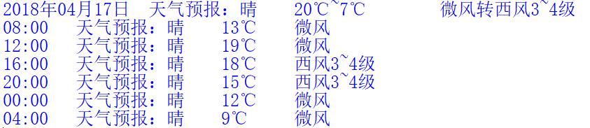 1 weather='2018年4月17日 \t 天气预报:{:s} \t 20C~7°℃ \t 微风转西风3~4级\n \