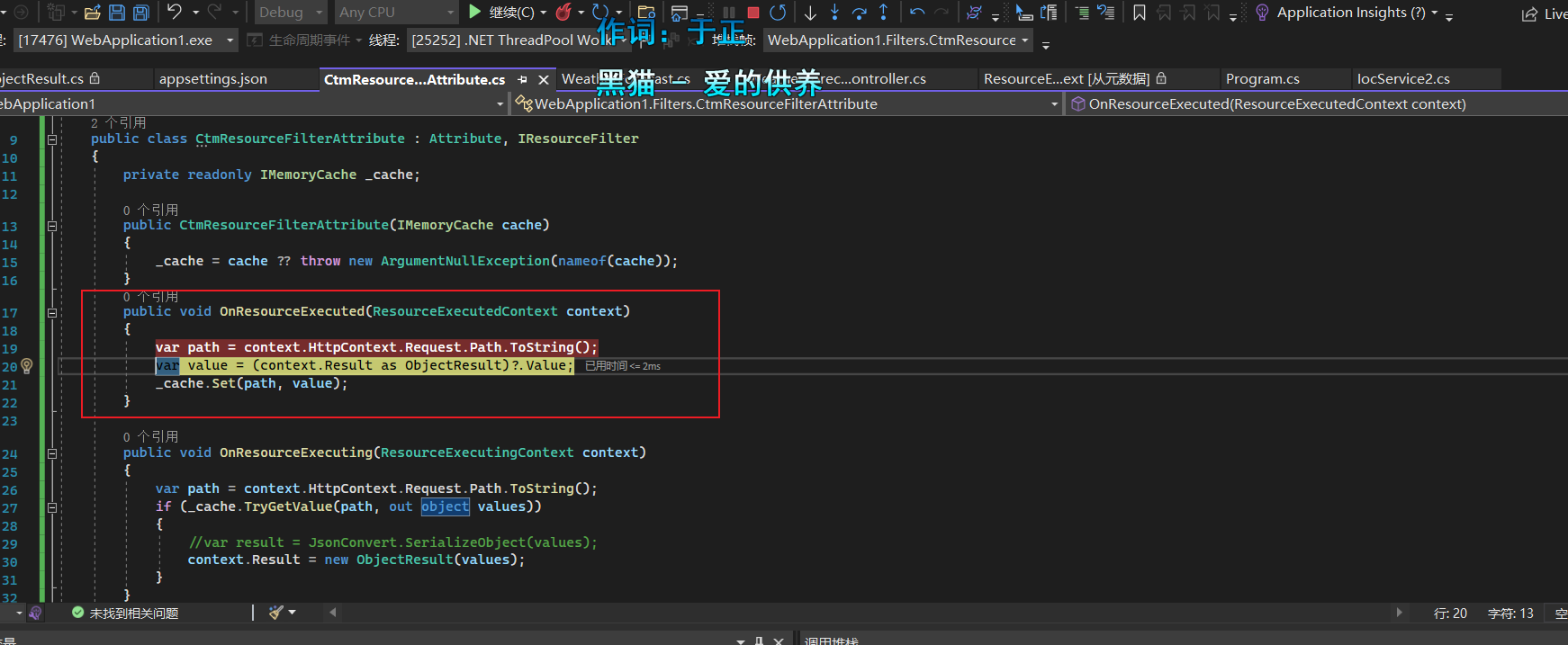 OnResourceExecuting:在第二次请求,乃至若干次后执行调用 拿到当前请求的Action地址最为Key去缓存中找然会返回即可