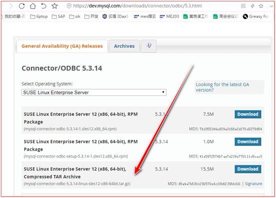 从上面网址下载mysql驱动 mysql-connector-odbc-5.3.14-linux-sles12-x86-64bit.tar.gz
