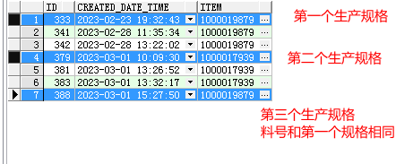 说明: 本表是演示一个生产过程,123 行是一次连续生产,然后456 行又切换到另外一个规格,到第7行又切换了一个规格,只是这个规格和第一行的一致