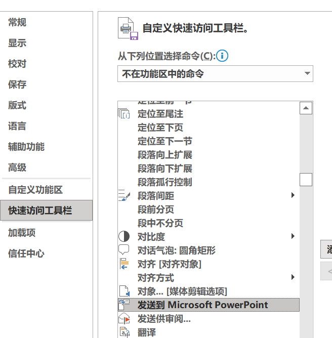 左上角小箭头点击自定义快速访问工具栏 其他命令 不在功能区中的命令 按字母顺序找到发