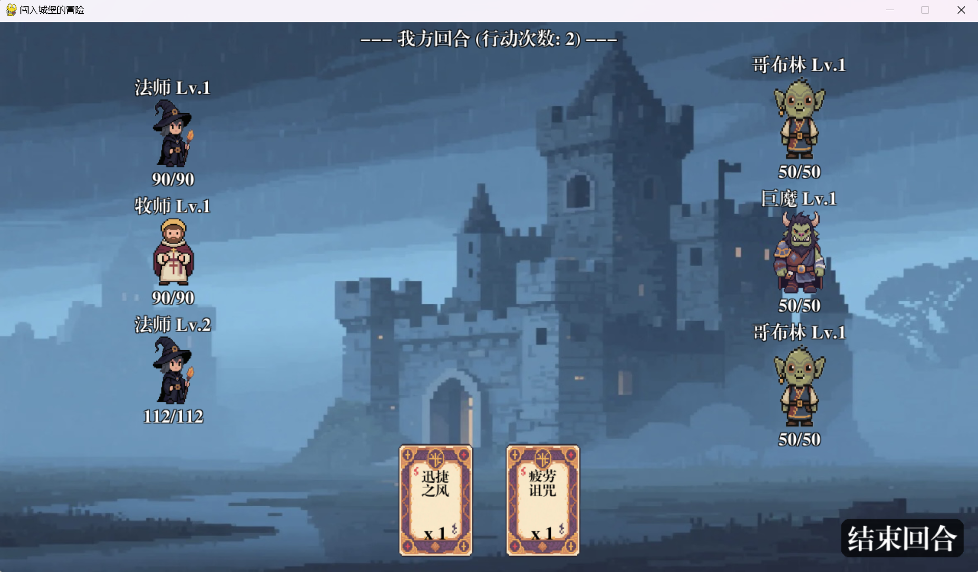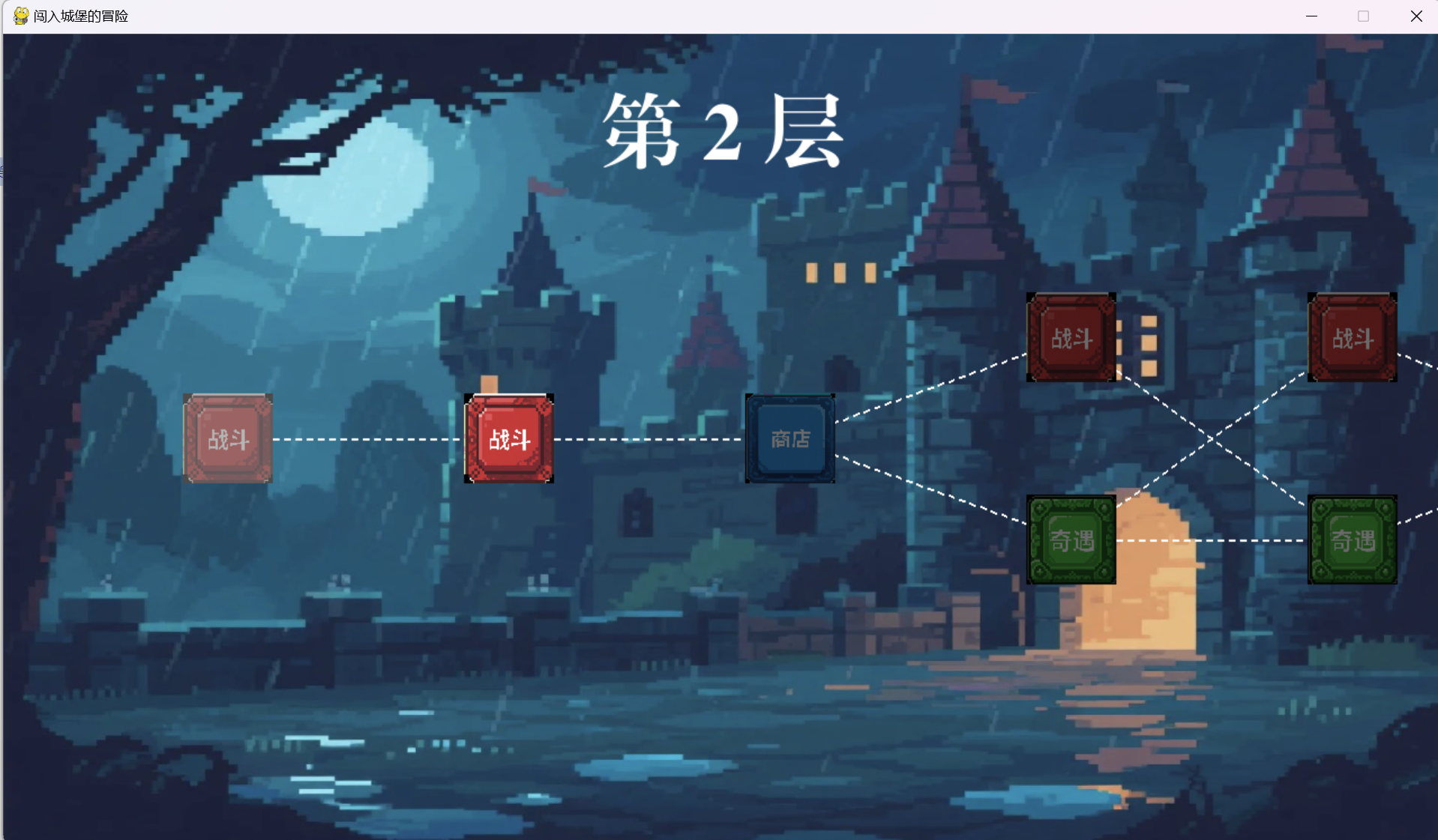 在核心玩法验证后。我引入了Pygame库,并创建了GUI类。这项工作是整个项目中工作量最大的一次重构。我为所有需要显示的游戏实体(角色、节点、卡牌)都添加了draw()方法,并通过ai进行游戏贴图的生成,重写了游戏主循环,将其改造为基于Pygame事件驱动的模式。经过这一阶段,游戏从一个抽象的命令行程序,变成了一个有图像、可交互的真实游戏。
