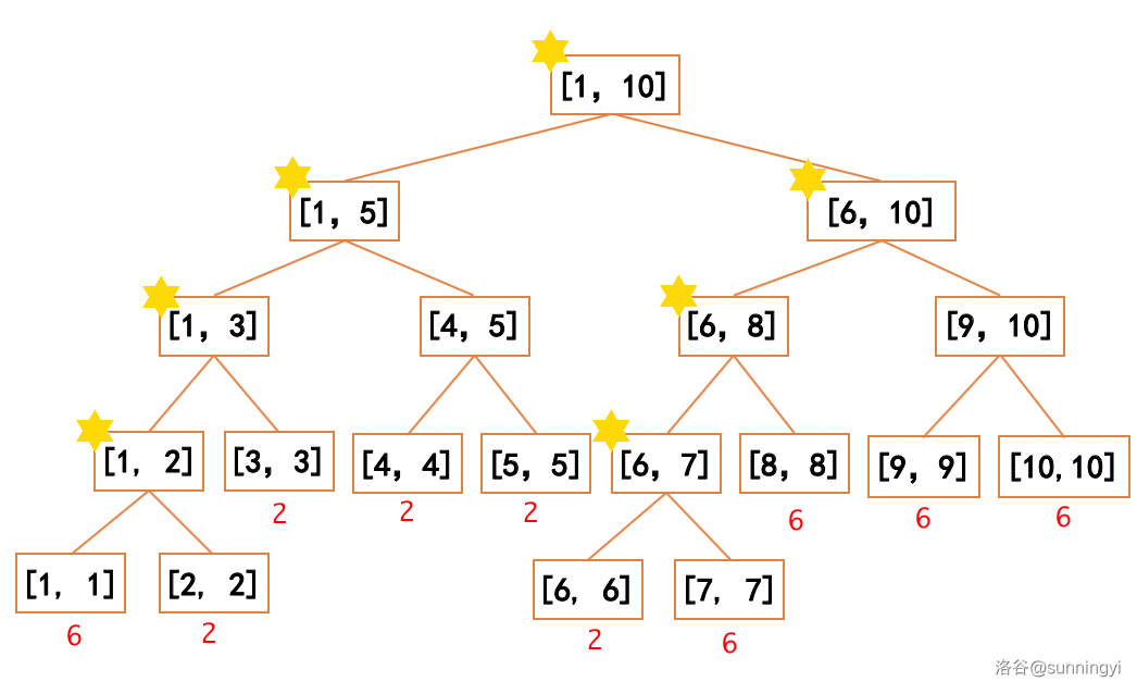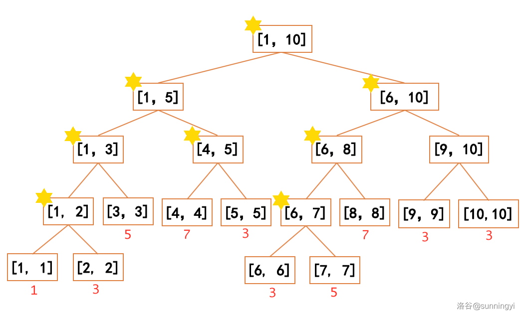 举例来说,对于下面图示的线段树,其标签分布情况如下: