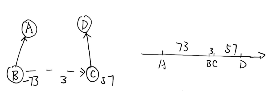 A B 100表示从 \(A\) 开始向右走 \(100\) 个单位长度可以到达 \(B\) 点。A B -100表示从 \(A\) 开始向左走 \(100\) 个单位长度可以到达 \(B\) 点。注意:如果你无法求解出两点之间距离,请给出一行