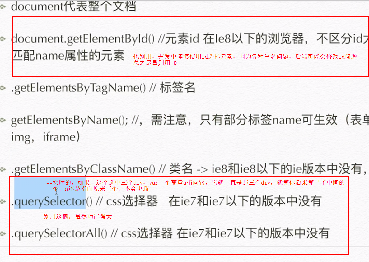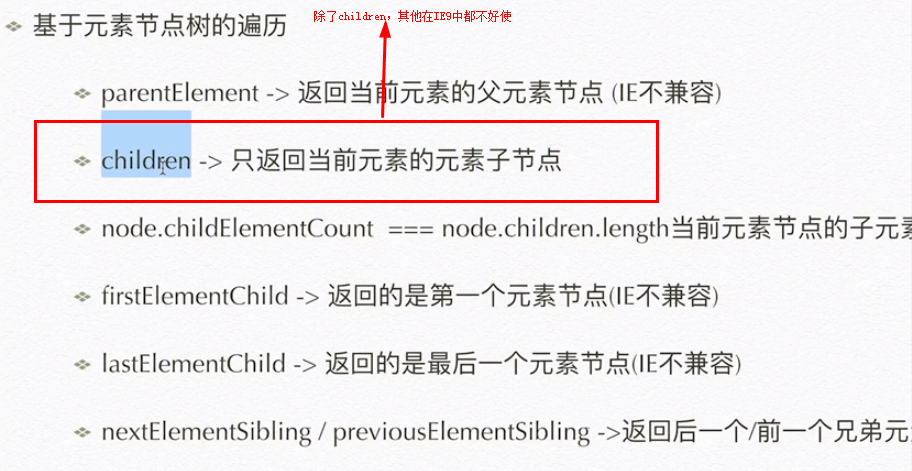 除了children 其他元素节点树方法在IE9以下都是没有实现的,因为从前微软的任性。这些方法虽然比上面的好使,但也别用,除了children