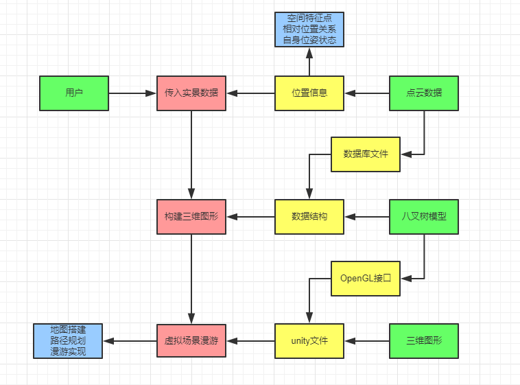 - Party:用户直接作为参与方将数据传入系统中;在传入实景数据时,点云数据作为位置信息参与其中;在构建三维图形时,点云数据作为数据库文件的数据结构,转化为八叉树模型;在虚拟场景漫游时,八叉树模型通过OpenGL接口转化为三维图形,并导入至unity中。
