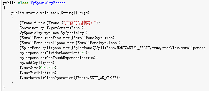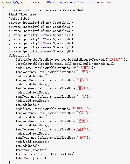 外观类(WySpecialty)用 JTree 组件来管理库存的名称,并定义一个事件处理方法 valueClianged(TreeSelectionEvent e),当用户从树中选择商品时,该商品的数量信息保存在标签(JLabd)对象中。