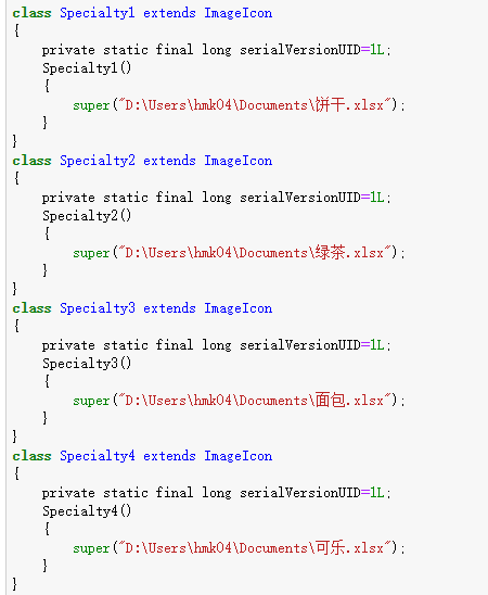 本实例的外观角色 WySpecialty 是 JPanel 的子类,它拥有 8 个子系统角色 Specialty1~Specialty8,它们是数据库类(ImageIcon)的子类对象,用来保存该商品的数量。