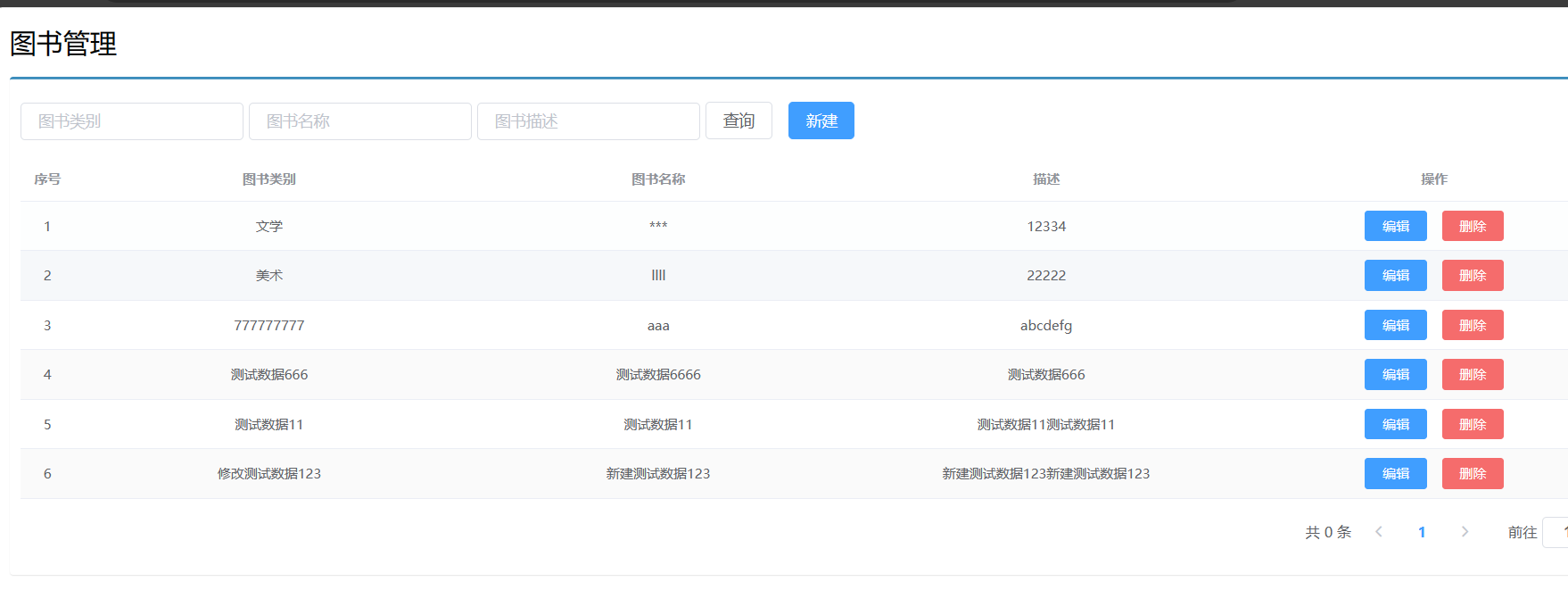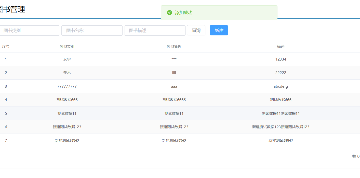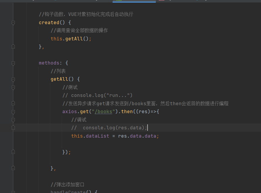 //钩子函数,VUE对象初始化完成后自动执行 created() { //调用查询全部数据的操作 this.getAll(); }, methods: { //列表 getAll() { //测试 // console.log("run...") //发送异步请求get请求发送到/books里面,然后then会返回的数据进行编程 axios.get("/books").then((res)=>{ //调试 // console.log(res.data); this.dataList = res.data.data; }); }, //弹出添加窗口 handleCreate() { //让添加窗口显示出来 this.dialogFormVisible = true; //在显示窗口之前,先清空一下表单 this.resetForm(); }, //重置表单 resetForm() { //清空数据 this.formData = {}; }, //添加 handleAdd () { //弹出的新增窗口中的提交按钮 //新增对应后端我们写的post请求 // 发请求的时候要把表单数据提交过去:表单名称:formData axios.post("/books",this.formData).then((res)=>{ //p判断操作是否成功 if(res.data.flag){ //关闭弹窗 this.dialogFormVisible = false; //给用户新建成功的信息 this.$message.success("添加成功"); }else { this.$message.error("添加失败"); } // //刷新数据 // this.getAll(); }).finally(()=>{ //不管是否成功都需要刷新一下数据 this.getAll(); }); }, //取消 cancel(){ //关闭新建的弹窗 this.dialogFormVisible=false; //给用户提示信息success是绿色小弹窗提示,error是红色小弹窗提示,info是灰色小弹窗显示 this.$message.info("当前操作取消") },