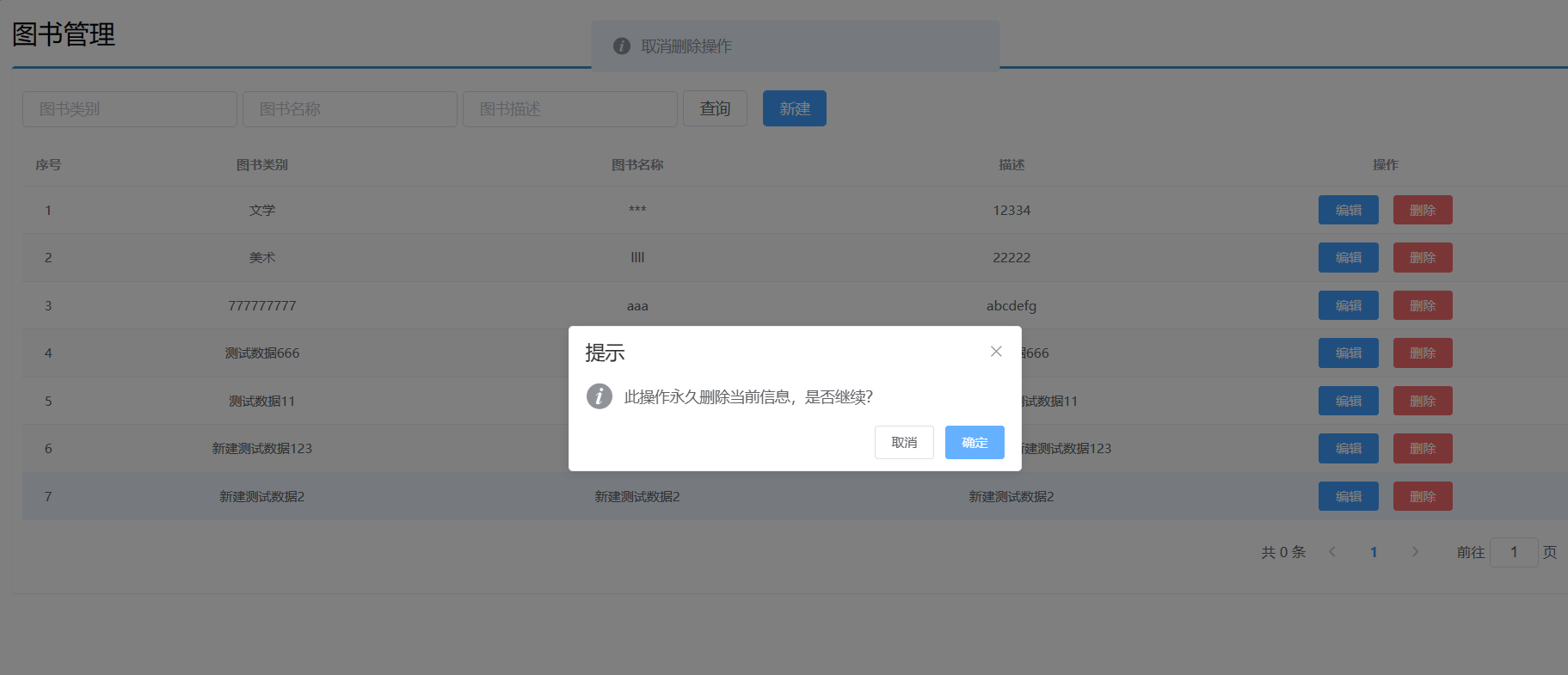 // 删除 handleDelete(row) { //通过控制台查看row数据是什么东西 // console.log(row); //2.带有删除提醒的代码 this.$confirm("此操作永久删除当前信息,是否继续?","提示",{type: "info"}).then(()=>{ //测试 // console.log("success"); axios.delete("/books/"+row.id).then((res)=>{ if(res.data.flag){ //给用户删除成功的信息 this.$message.success("删除成功"); }else { this.$message.error("删除失败"); } }).finally(()=>{ this.getAll(); }); }).catch(()=>{ //测试 // console.log("fail"); this.$message.info("取消删除操作"); }); },