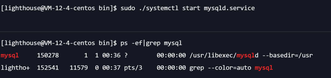 9、我使用命令cd /bin进入bin目录,再执行命令sudo ./systemctl start mysqld.service成功启动mysql服务,虽然无提示信息,我们可以通过命令ps -ef | grep mysql查看到mysql服务已经成功开启: