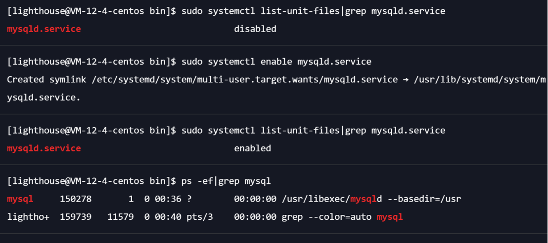 3) 再此执行命令sudo systemctl list-unit-files|grep mysqld.service查询的时候mysql已改为开机自启动模式了。