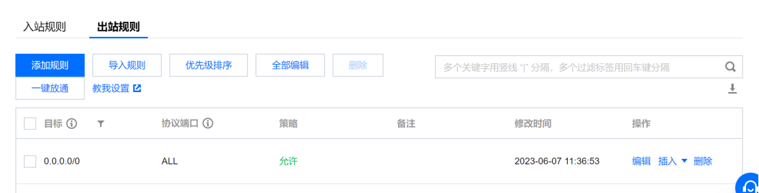 2) 为防止成功部署后端项目后,通过浏览器网址访问不到项目接口,先设置安全组的入站、出战规则。