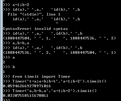 >>> Timer('a,b = b,a', 'a=1; b=2').timeit()