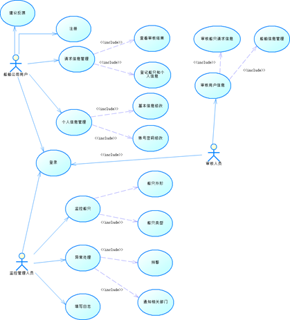 我们组项目是基于深度学习的船舶识别和异常检测,就该项目而言本身是一个重算法(深度学习,yolov3)的项目,要求是能够识别出视频中的船只并且观测其有无异常,但如果单纯这样就无法满足课程的要求(数据库和页面),因此我们需要对它进行衍生拓展一些业务层面的功能,然后进一步的需求分析。由于这个web应用本身是给港口的工作人员使用的,那么联系生活实际可以想到既然是港口人员使用,那么驾驶船只(船舶公司或是个人)的也可以作为其中的一个用户,他们需要通过这个应用提交准许申请,既然有人提交申请那么必然有人审核于是就诞生了审核人员这一分支。而港口的工作人员已经分出了审核人员,那么对于监控的观看与处理则也应有专门的人员负责即监控人员。到这里,三方使用者及其功能已经分出来了,再往下走就是用户的注册登录这些,对于船舶公司来说他们是需要注册的,而另外两方则属于官方给予的权限,也就是说登录上就分为了三方,三方是无法互相访问彼此的界面,但有些信息却可以看到,比如船舶公司方面提交的申请,审核人员处会有汇总等。然后在此基础上,我们组内互相讨论,进一步完善一下需求。