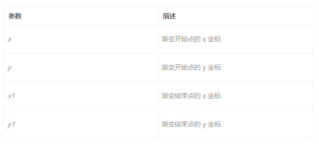createLinearGradient(x,y,x1,y1)</pre>