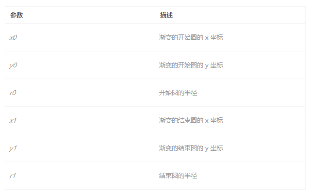 createRadialGradient(x0,y0,r0,x1,y1,r1);</pre>