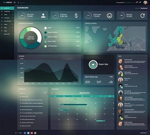 React Blur admin 可用于在 React 应用程序上构建管理界面。这个模板有表格、表单、地图、图表、 UI 特性、配色方案、页面等等