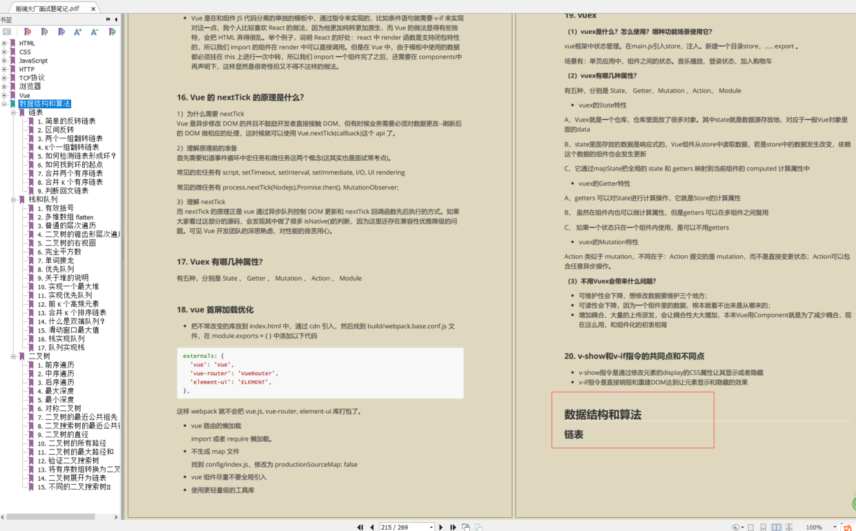 这份前端面试题笔记添加上了数据结构和算法,小编发现还是有小伙伴算法这块比较薄弱,后面会专门针对算法的知识、学习方法等方面写篇文章(提前预告下嘿嘿),而这份资料就请点击这立即获取噢