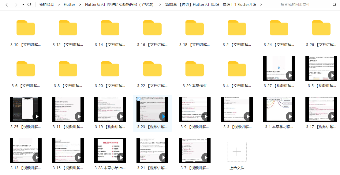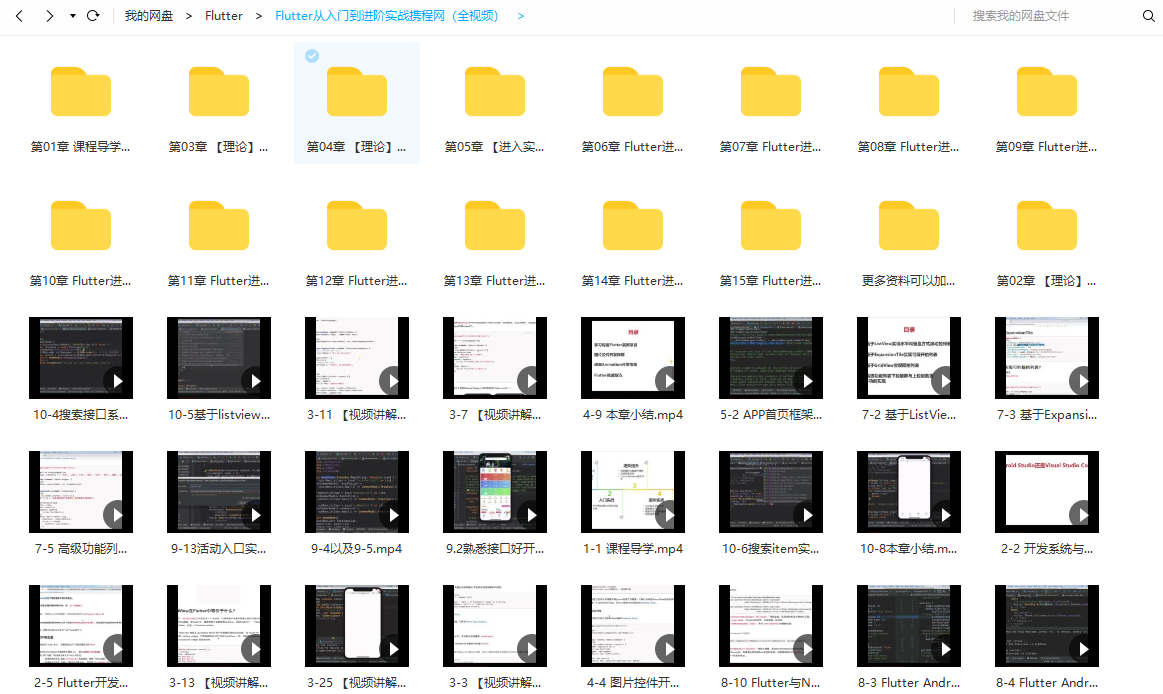 这部分内容视频可以说是重中之重,重头戏吧,涉及到网络编程与数据存储技术相关经验和技巧、玩转列表组件、Flutter,Native混合开发、App首页功能开发、搜索模块开发、开发包和插件开发、智能AI语音搜索模块实现、打包发布Flutter应用等内容,真不亏是进阶,慢慢啃下来把。
