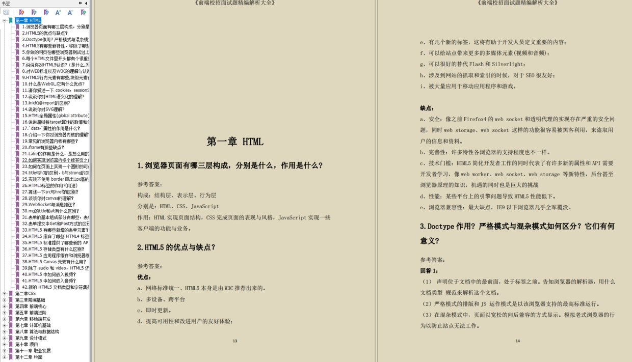 校招面试侧重潜力考察。在前端这条路上,学习能力看你能否走得快,学习欲望看你能否走得远。而前端基础是你获得面试机会的资本,而从前端知识掌握情况折射出来的潜力特质,才是你脱颖而出的亮点。这份前端校招面试精编解析文档内容包括了HTML、CSS、前端基础、前端核心、移动端开发、计算机基础、项目、职业发展及HR面,面试问题和掌握的知识都详细写明,没有JS部分,会和另外一份javaScript前端经典面试题一起分享到小伙伴的。