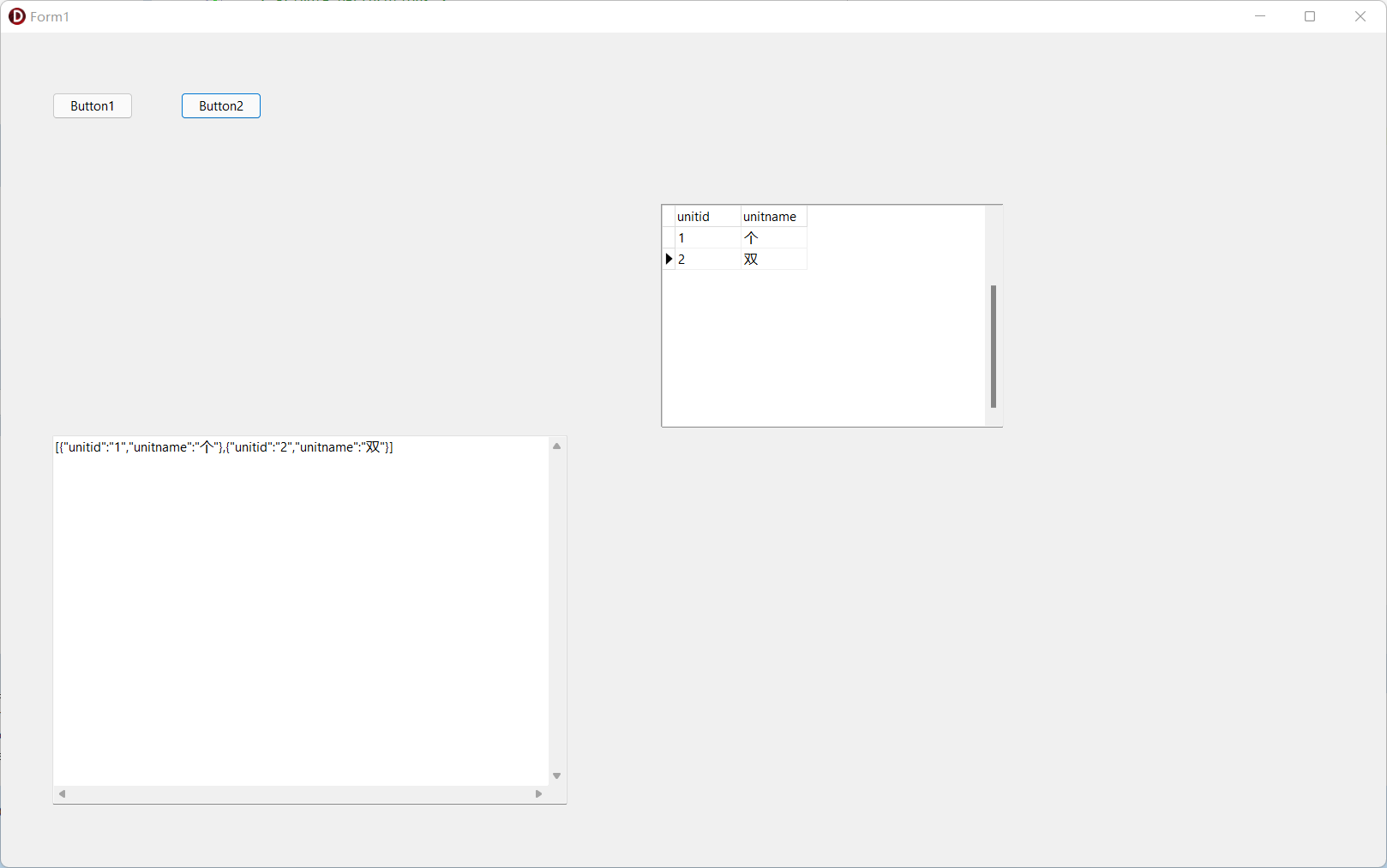 procedure TForm1.Button1Click(Sender: TObject); begin var b: TDatasetToJSONBridge := TDatasetToJSONBridge.Create; b.Dataset := FDMemTable1; var jo: TJSONObject := TJSONObject(b.Produce); Memo1.Text := jo.ToString; memo1.Lines.Add(b.FieldNames.Text); b.Free; FDMemTable2.close; FDMemTable2.FieldDefs.Assign(FDMemTable1.FieldDefs); FDMemTable2.CreateDataSet; end; procedure TForm1.Button2Click(Sender: TObject); begin var b: TJSONToDataSetBridge := TJSONToDataSetBridge.Create(nil); b.Dataset := FDMemTable2; b.Append(TJSONObject.ParseJSONValue(memo1.Text)); b.Free; end;
