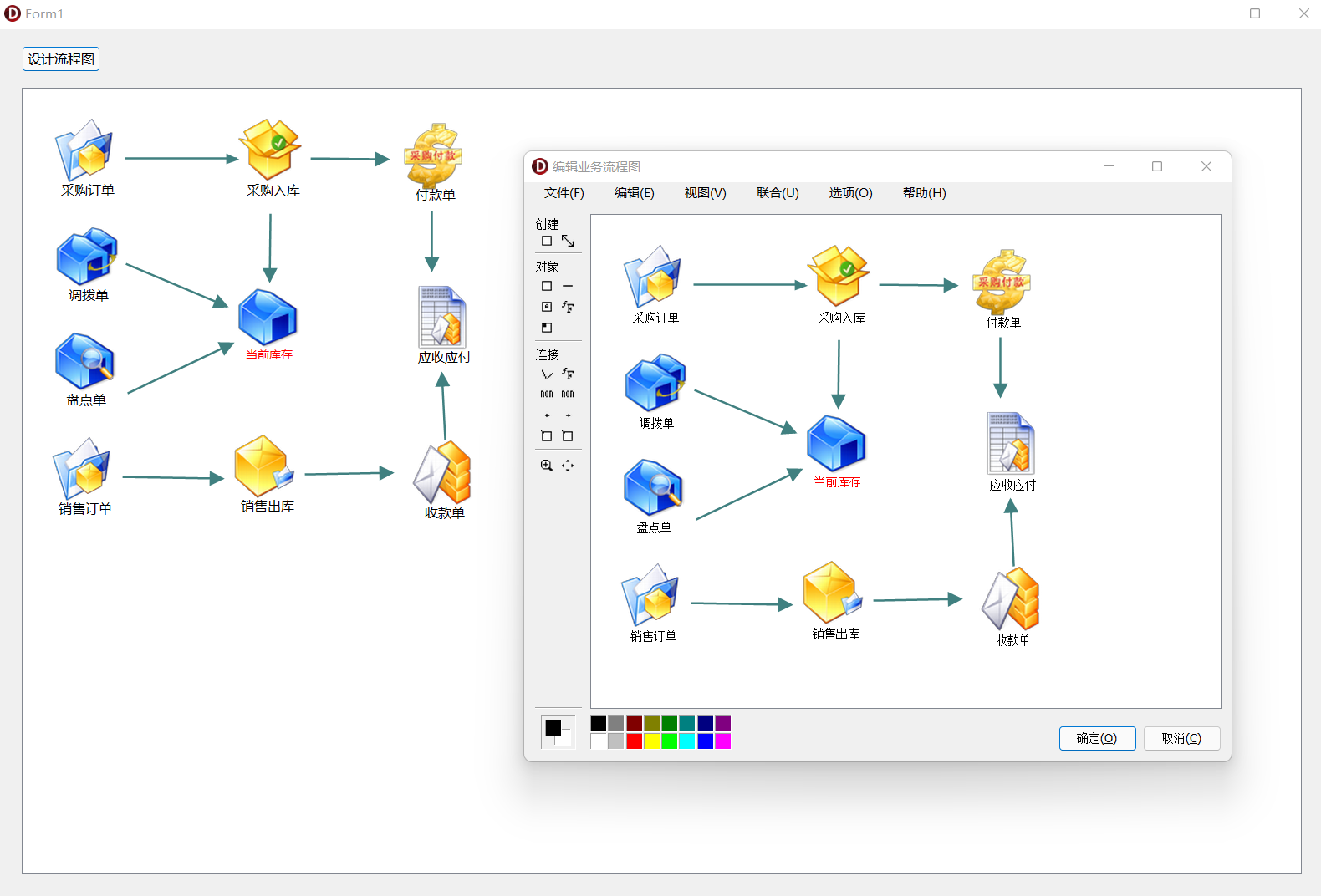 procedure TForm1.Button1Click(Sender: TObject); //设计流程图 var LEditor: TFChartEditor; //uses dxFcEdit begin LEditor := TFChartEditor.Create(nil); try LEditor.Caption := '编辑业务流程图'; LEditor.Chart.Images := cxImageList1; LEditor.Chart.LoadFromFile(ExtractFilePath(Application.ExeName) + 'flow.flc'); LEditor.ShowModal; finally LEditor.Free; end; end; procedure TForm1.dxFlowChart1DblClick(Sender: TObject); var LObj: TdxFcObject; // tab: tcxtabsheet; begin LObj := dxFlowChart1.SelectedObject; if LObj = nil then Exit; if LObj.Data = nil then Exit; // fMain.LoadBPL(pitem(obj.Data).bplname); // tab := fMain.GetTabsheet(pitem(obj.Data).funcname); // if tab <> nil then // fMain.PageControl1.ActivePage := tab // else // fMain.LoadPlugin(pitem(obj.Data).formclassname, pitem(obj.Data).funcname, pitem(obj.Data).bplname); end; procedure TForm1.FormClose(Sender: TObject; var Action: TCloseAction); begin FreeFlow; end; procedure TForm1.FormShow(Sender: TObject); begin dxFlowChart1.Images := cxImageList1; dxFlowChart1.LoadFromFile(ExtractFilePath(ParamStr(0)) + 'flow.flc'); setFlow; end; procedure TForm1.FreeFlow; var i: integer; LObj: TdxFcObject; begin if dxFlowChart1.ObjectCount = 0 then Exit; for i := 0 to dxFlowChart1.ObjectCount - 1 do begin LObj := dxFlowChart1.Objects[i]; // if LObj.Data <> nil then // Dispose(pitem(LObj.Data)); end; end; procedure TForm1.SetFlow; var i: Integer; LObj: TdxFcObject; // p: pitem; begin for i := 0 to dxFlowChart1.ObjectCount - 1 do begin LObj := dxFlowChart1.Objects[i]; // if dmDB.cdsFunction.Locate('funcname', VarArrayOf([LObj.Text]), []) then // begin // New(p); // p.bplname := dmDB.cdsFunction.FieldByName('bplname').Text; // p.funcname := LObj.Text; // p.formclassname := dmDB.cdsFunction.FieldByName('formname').Text; // LObj.Data := p; // end; end; end;