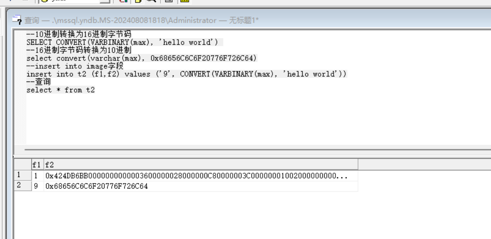 --10进制转换为16进制字节码 SELECT CONVERT(VARBINARY(max), 'hello world') --16进制字节码转换为10进制 select convert(varchar(max), 0x68656C6C6F20776F726C64) --insert into image字段 insert into t2 (f1,f2) values ('9', CONVERT(VARBINARY(max), 'hello world')) --查询 select * from t2