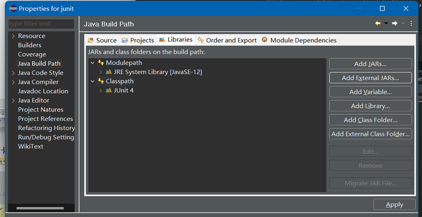 1、 在要使用Junit的project名上,点击properties--java build path-libraries, 点击Add library(如图四),选择Junit即可。点击Add library,在弹出的对话框中选择Jnuit(如图五),接下来选择junit版本(如图六)即可。