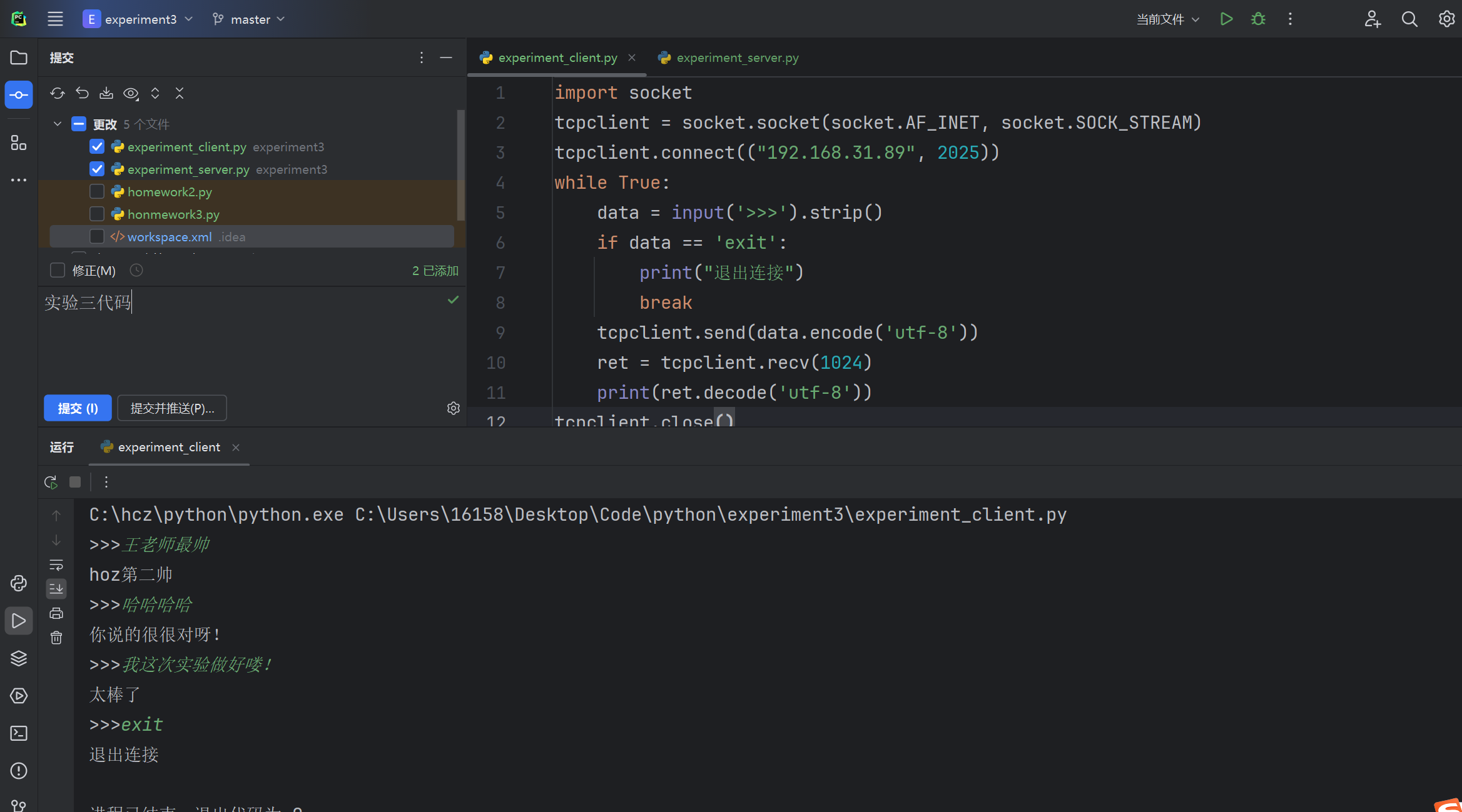 通过本次实验,我了解到了socket的使用方法,我创建了服务端和客户端,监听了多个客户的请求,遇到的一个最主要的问题就是不知道IP地址该绑定哪一个,是要绑定服务端的。发现了拍摄的强大之处,是面向对象设计的,其中有很多模块非常方便,非常容易使用,比c语言的功能更简洁更方便。
