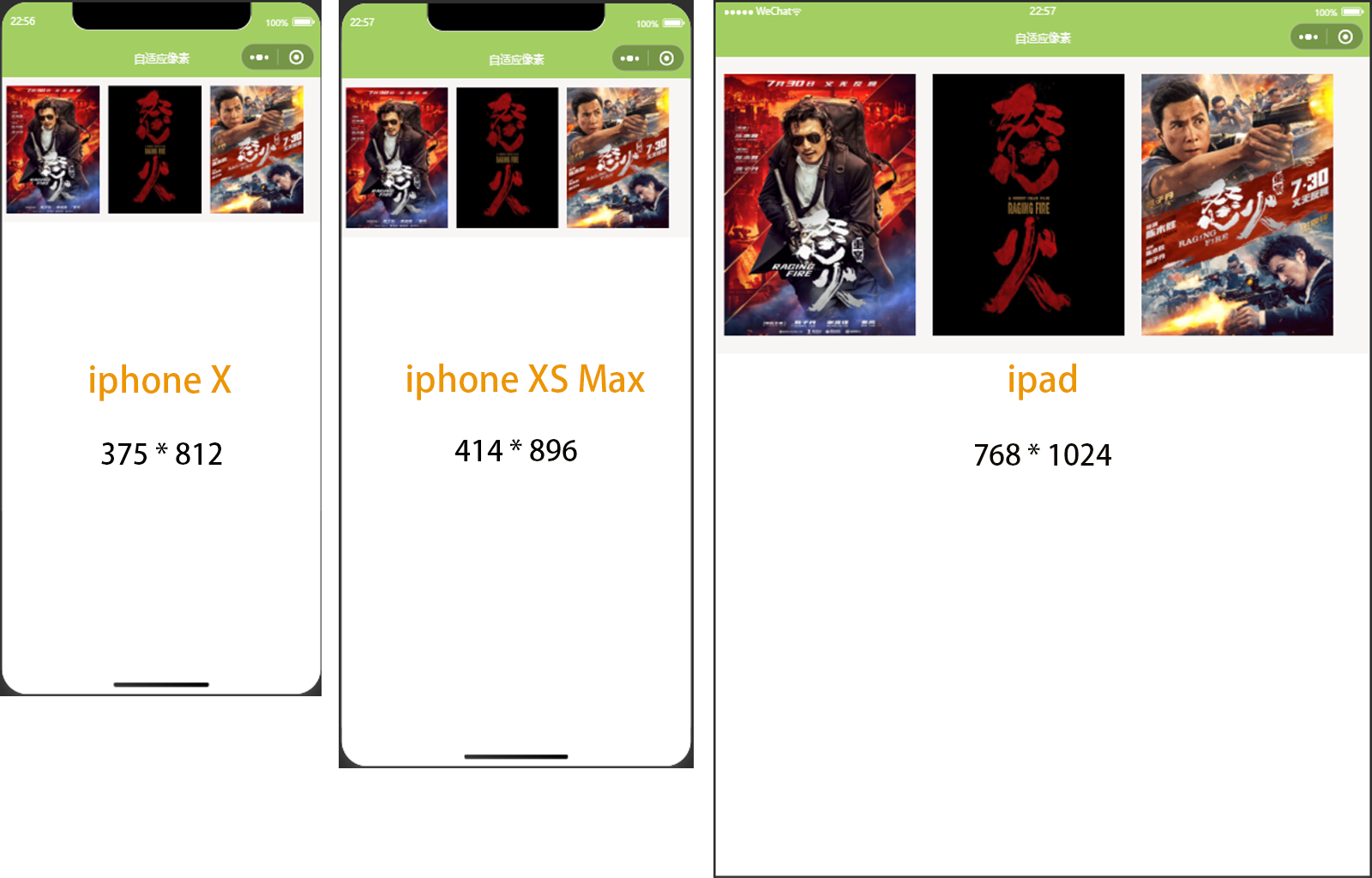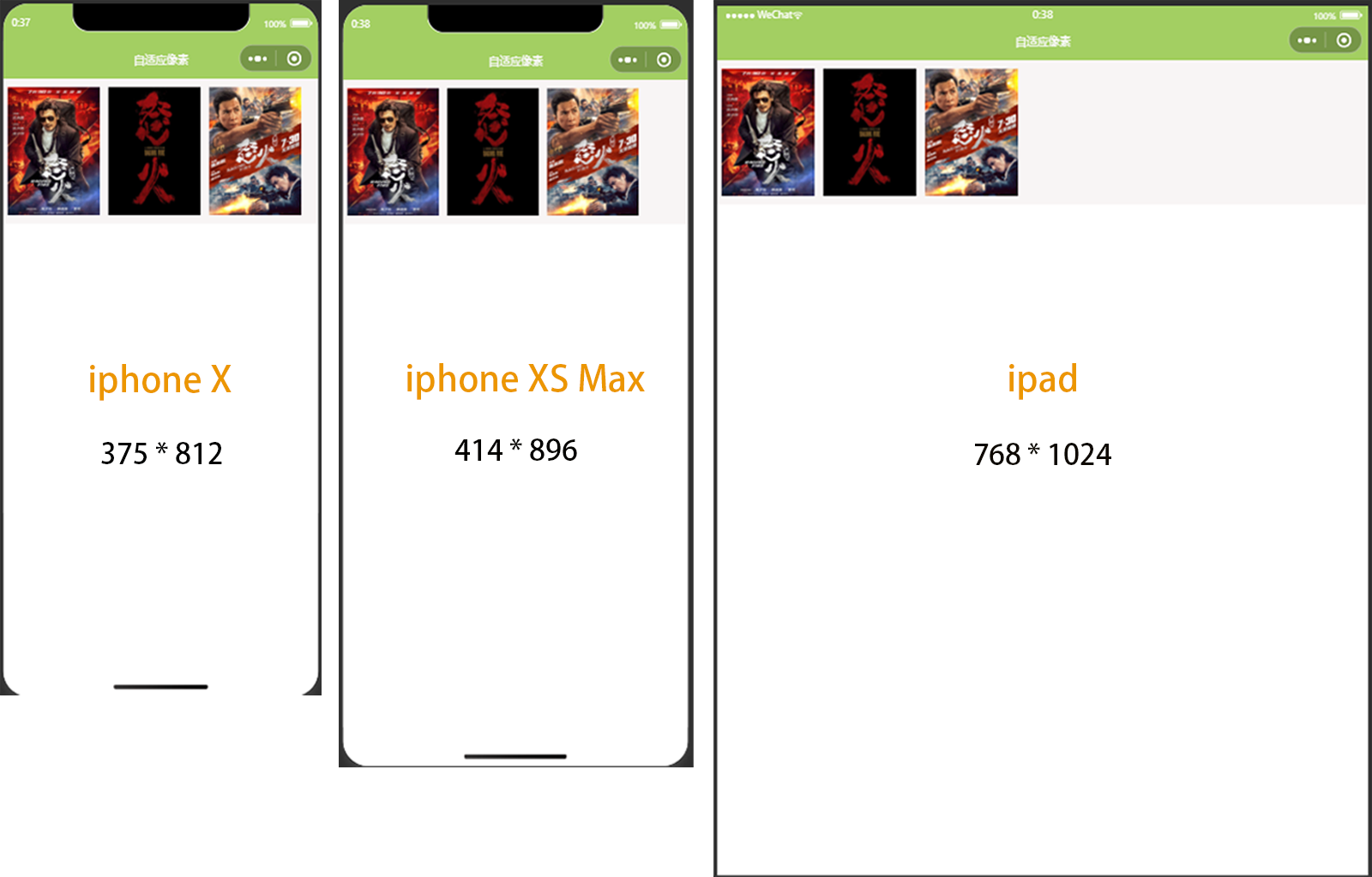 从上图可以看到,该页面在iphoneX中的显示效果是正常的,屏幕宽度刚好放下3张海报;