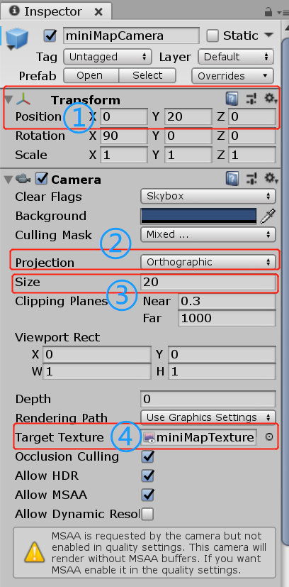 新建一个Camera作为角色(摄像机跟随对象)的子物体,命名为miniMapCamera,把miniMapTexture拖到Target Texture。