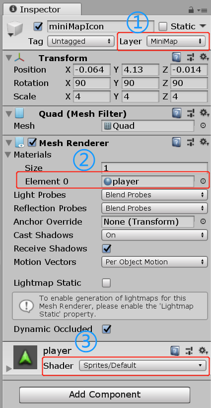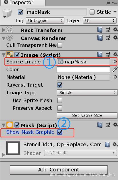 新建一个Image,命名为mapMask,拖遮罩图到①。添加组件Mask。Mask组件的作用是将地图不想显示的部分遮住,比如一般小地图的形状都是圆形的,那么Source Image应该是一个圆形图像,这样就只会显示圆形中的部分。