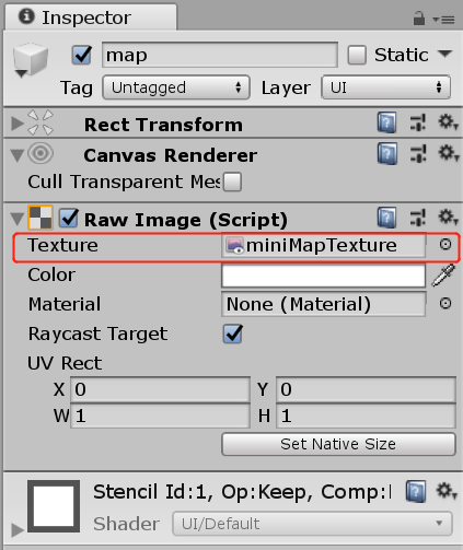 新建一个Raw Image作为mapMask的子物体,拖miniMapTexture到Texture字段