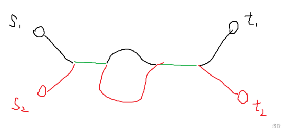 如果重合部分有两个,那么 \(s1\) 和 \(s2\) 一定都可以走中间非重合部分中更短的那一条,使得重合部分只有一个。