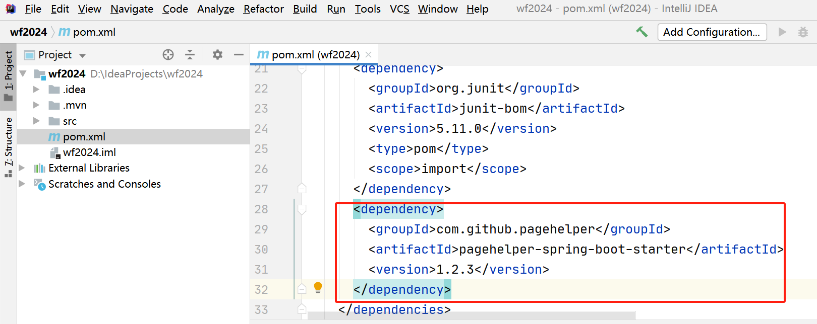 <?xml version="1.0" encoding="UTF-8"?> <project xmlns="http://maven.apache.org/POM/4.0.0" xmlns:xsi="http://www.w3.org/2001/XMLSchema-instance" xsi:schemaLocation="http://maven.apache.org/POM/4.0.0 http://maven.apache.org/xsd/maven-4.0.0.xsd"> <modelVersion>4.0.0</modelVersion> <groupId>cn.holly</groupId> <artifactId>wf2024</artifactId> <version>1.0-SNAPSHOT</version> <name>wf2024</name> <!-- FIXME change it to the project's website --> <url>http://www.example.com</url> <properties> <project.build.sourceEncoding>UTF-8</project.build.sourceEncoding> <maven.compiler.release>17</maven.compiler.release> </properties> <dependencyManagement> <dependencies> <dependency> <groupId>org.junit</groupId> <artifactId>junit-bom</artifactId> <version>5.11.0</version> <type>pom</type> <scope>import</scope> </dependency> <dependency> <groupId>com.github.pagehelper</groupId> <artifactId>pagehelper-spring-boot-starter</artifactId> <version>1.2.3</version> </dependency> </dependencies> </dependencyManagement> <dependencies> <dependency> <groupId>org.junit.jupiter</groupId> <artifactId>junit-jupiter-api</artifactId> <scope>test</scope> </dependency> <!-- Optionally: parameterized tests support --> <dependency> <groupId>org.junit.jupiter</groupId> <artifactId>junit-jupiter-params</artifactId> <scope>test</scope> </dependency> </dependencies> </project>