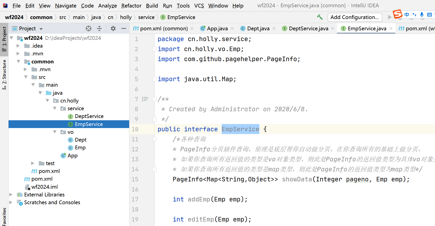 package cn.holly.service; import cn.holly.vo.Emp; import com.github.pagehelper.PageInfo; import java.util.Map; /** * Created by Administrator on 2020/6/8. */ public interface EmpService { /*各种查询 * PageInfo分页插件查询,原理是底层帮你自动做分页,在你查询所有的基础上做分页, * 如果你查询所有返回值的类型是vo对象类型,则此处PageInfo的返回值类型为具体vo对象类型 * 如果你查询所有返回值的类型是map类型,则此处PageInfo的返回值类型为map类型*/ PageInfo<Map<String,Object>> showData(Integer pageno, Emp emp); int addEmp(Emp emp); int editEmp(Emp emp); int delEmp(Integer empno); }