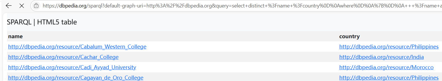 select distinct ?name ?country where { ?name a <http://dbpedia.org/ontology/University>. optional { ?name <http://dbpedia.org/ontology/country> ?country. } }