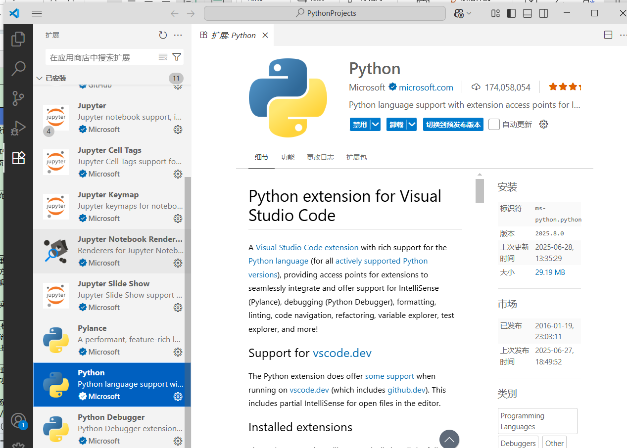 - 安装完成后,VSCode会自动为你启用Python语言支持,并显示相关功能。