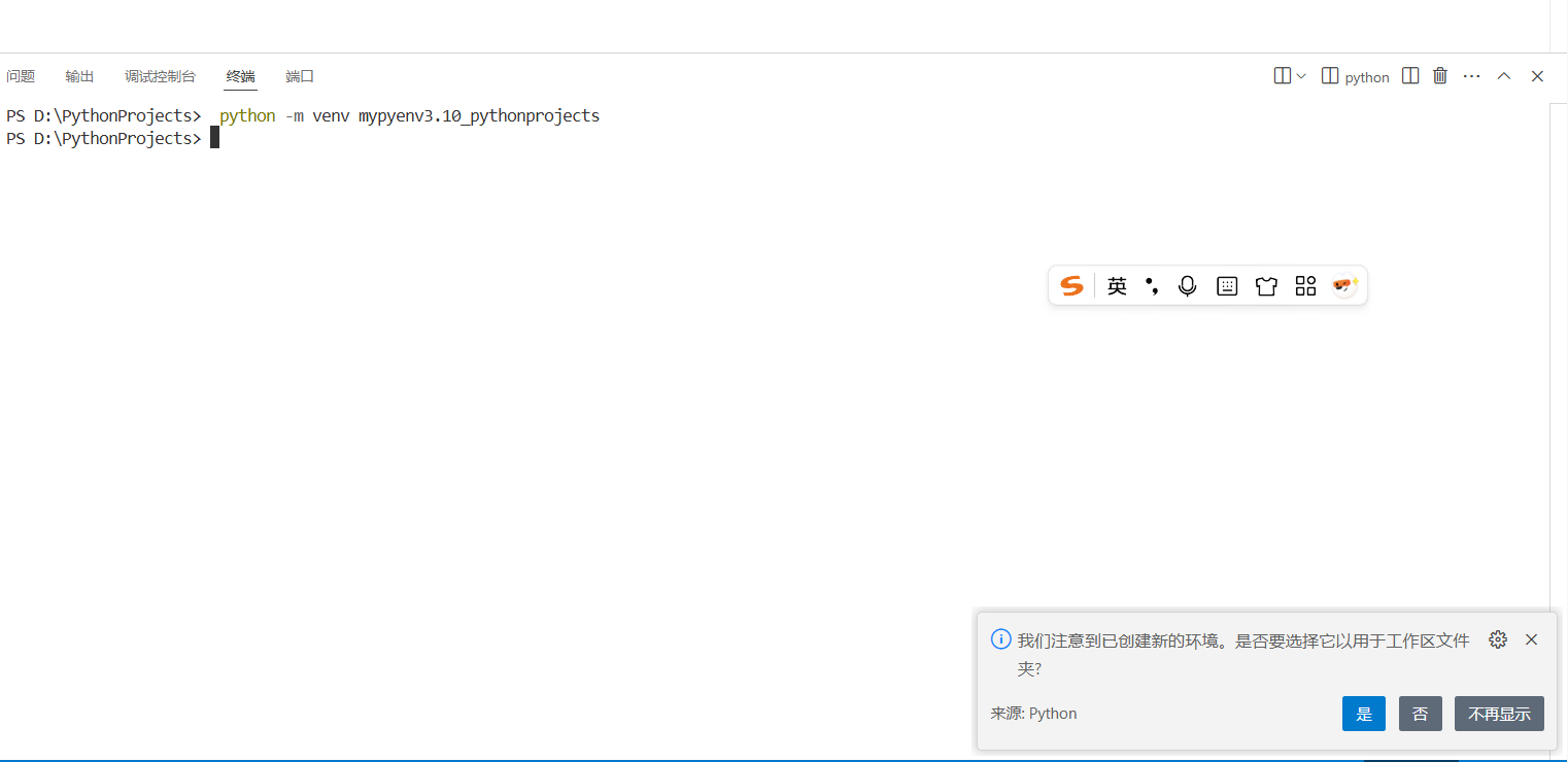 例如,我的文件夹是D:\PythonProjects,则创建后的虚拟环境文件夹为D:\PythonProjects\mypyenv3.10_pythonprojects