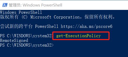 (首先用管理员模式运行 Windows PowerShell , 然后输入get-ExecutionPolicy 取得shell的当前执行策略,看到返回了 Restricted 或remotesigned默认值)