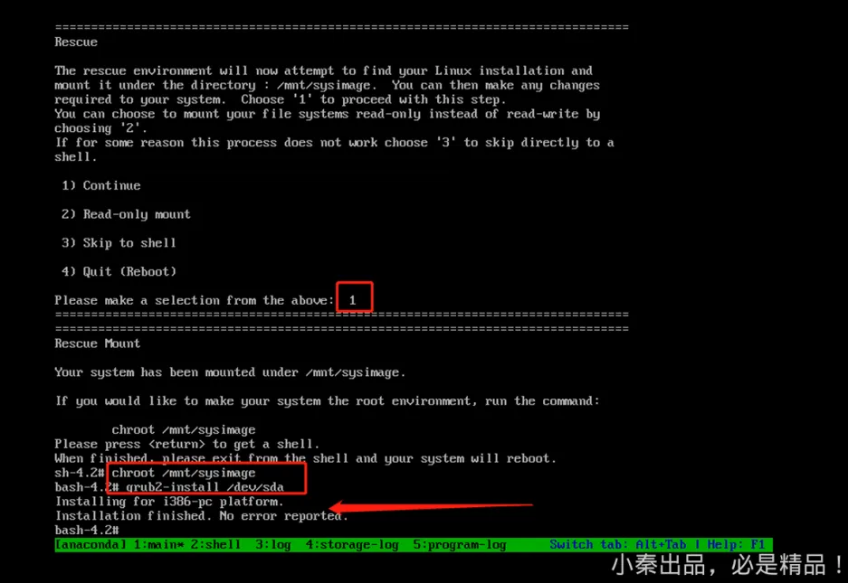 d. 选择1,继续进行,接下来,我们就会进入到一个shell模式中,需要切换根目录