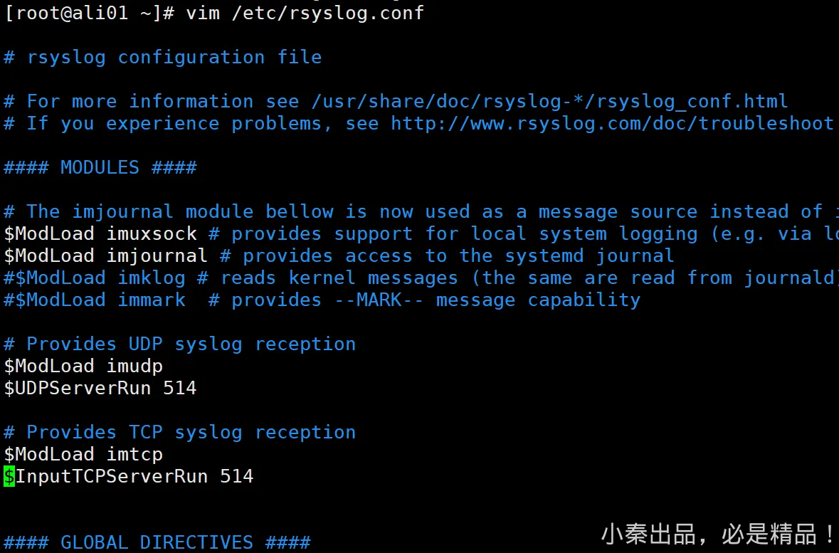 vim打开rsyslog的配置文件,将ModLoad imudp和ModLoad imtcp两个模块打开(就是把前面的#删除就好了),表示使用UDP和TCP协议,打开日志接收的功能,端口是514;