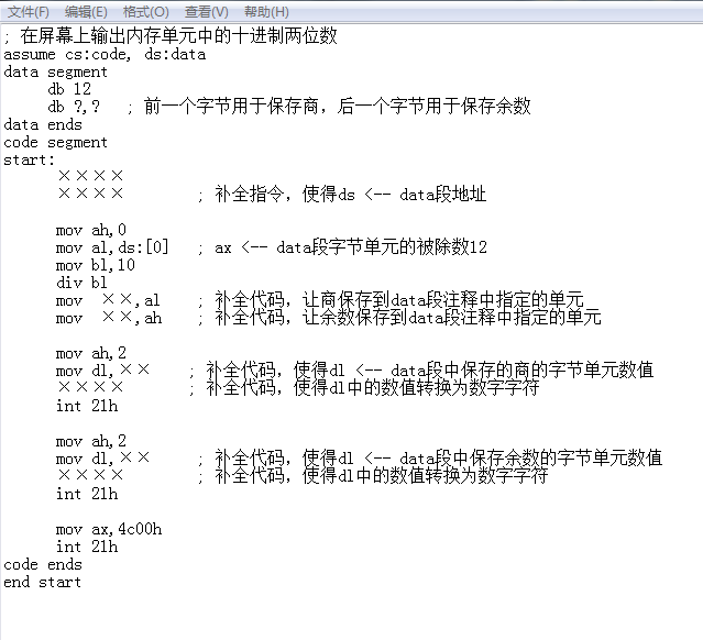 ; 在屏幕上输出内存单元中的十进制两位数感觉就是取模() assume cs:code, ds:data data segment db 12 ;小于65565可以用ax寄存器存。一般都是以是16个字节为单位分配 db 0,0 ;前一个字节用于保存商,后一个字节用于保存余数 data ends code segment start: mov ax,data mov ds,ax ; 补全指令,使得ds <-- data段地址 mov ah,0; mov al,ds:[0] ; ax <-- data段字节单元的被除数12;书上提到16位被除数默认于AX中 mov bl,10 div bl ;(ax)/(bl) mov ds:[1h],al ; 补全代码,让商保存到data段注释中指定的单元 mov ds:[2h],ah ; 补全代码,让余数保存到data段注释中指定的单元 mov ah,2 mov dl,ds:[1] ; 补全代码,使得dl <-- data段中保存的商的字节单元数值 mov al,dl or al,30h mov dl,al int 21h; 补全代码,使得dl中的数值转换为数字字符(1)从内存单元中取出完成 mov ah,2 mov dl,ds:[2] ; 补全代码,使得dl <-- data段中保存余数的字节单元数值 mov al ,dl or al,30h mov dl,al ; 补全代码,使得dl中的数值转换为数字字符 int 21h mov ax,4c00h int 21h code ends end start