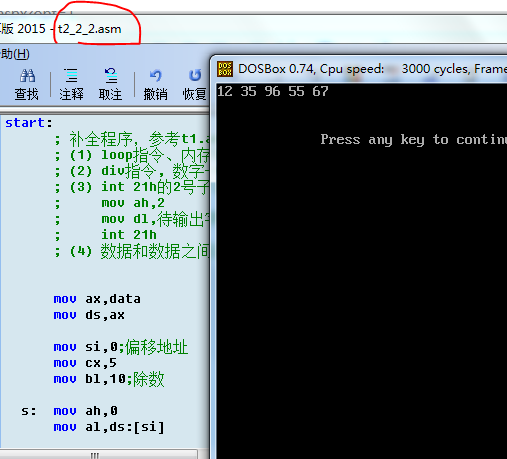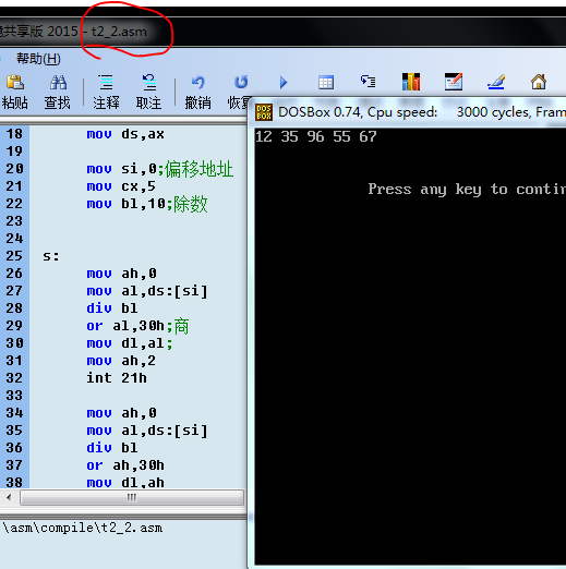 assume cs:code, ds:data data segment db 12,35,96,55,67 data ends code segment start: ; 补全程序,参考t1.asm,综合应用以下知识完成: ; (1) loop指令、内存单元地址的灵活表示 ; (2) div指令, 数字→数字字符的转换 ; (3) int 21h的2号子功能,完成单个字符输出的方法,即: ; mov ah,2 ; mov dl,待输出字符或其ASCⅡ码 ; int 21h ; (4) 数据和数据之间以空格间隔的实现: 使用(3)输出空格字符 mov ax,data mov ds,ax mov si,0;偏移地址 mov cx,5 mov bl,10;除数 s: mov ah,0 mov al,ds:[si] div bl or al,30h;商 mov dl,al; mov ah,2 int 21h mov ah,0 mov al,ds:[si] div bl or ah,30h mov dl,ah mov ah,2 int 21h mov dl,' ' mov ah,2 int 21h inc si loop s mov ax,4c00h int 21h code ends end start