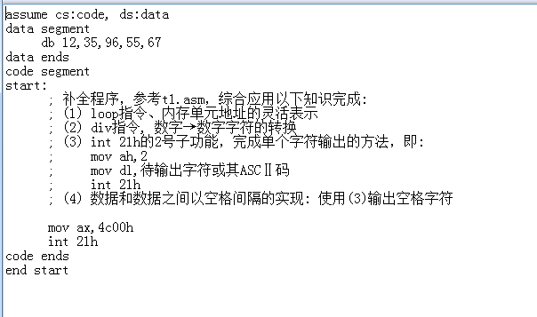 补全程序 t2.asm,完成在屏幕上输出 data 段定义的 5 个十进制两位数,数据和数据 之间以空格间隔。