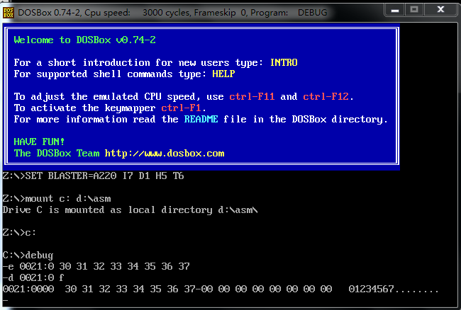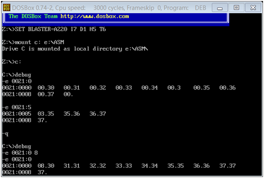 截图记录:使用 e 命令修改 0021:0~0021:f 数据,及修改后查看是否正确写入的操作